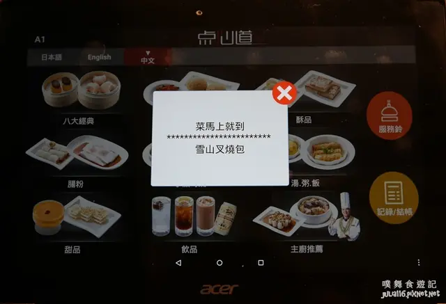餐點送達之後,螢幕會出現送餐通知,覺得蠻有趣的不是應該早點通知才有意義嗎XD