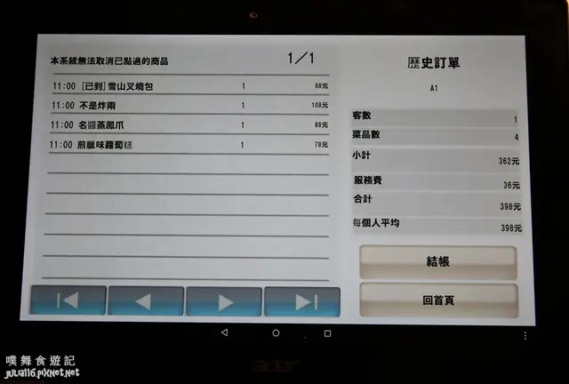 用餐過程中可以隨時點選"紀錄"查看餐點明細,費用也一併顯示在右側囉