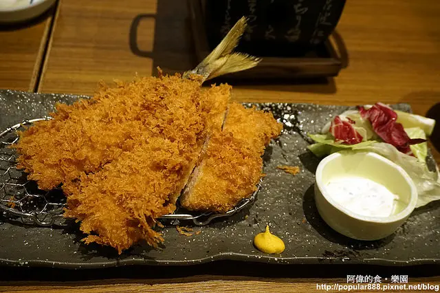 首先吃吃看"酥炸竹莢魚腰內豬排套餐",白色的是主廚特製的卡塔醬,看起來就很迷人。
