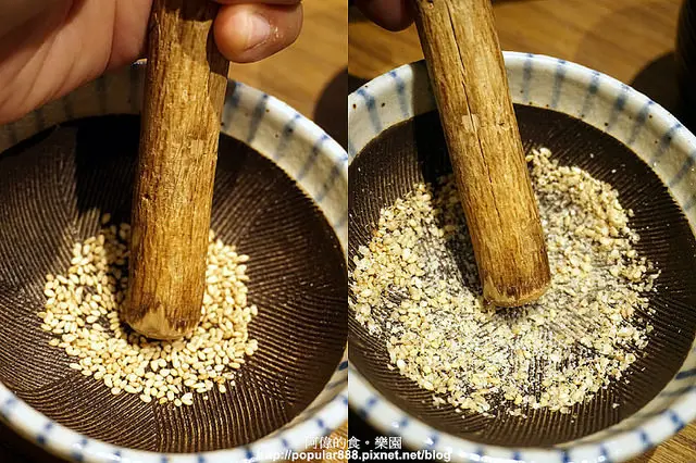 上桌時可看到附有兩碟醬,分別是芥末醬油(左)與柑橘醋蘿蔔泥(右)。