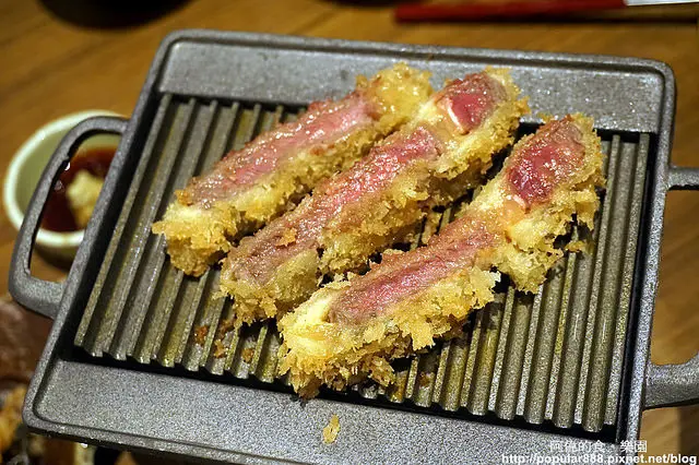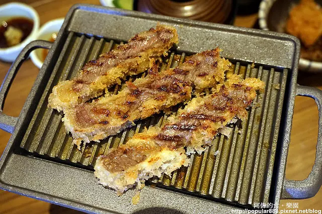 有生熟度的炸牛排,您吃過嗎?採用肉質鮮嫩、紋理細膩的紐西蘭肋眼牛肉,輕裹新鮮麵包粉酥炸至三分熟度上桌,帶著粉紅色擇的炸牛排,肉質鮮嫩,因考量每位顧客的喜好,勝勢以熱鐵板盛盤,讓顧客可依個人喜好,自我主宰牛排生熟度,是日式豬排料理中首創的創意吃法!另再提供兩款不同沾醬--芥末醬油及柑橘醋蘿蔔泥,口味多元變化,絕對顛覆您對傳統炸豬排料理的刻板印象。