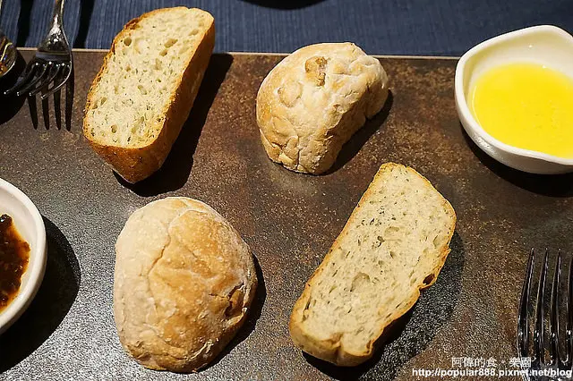另一款沾醬是海鹽橄欖油,將海鹽加在橄欖油裡,我還是第一次見到。沒想到沾著麵包吃,那種帶著一點鹹的橄欖油口感,蠻提味的!