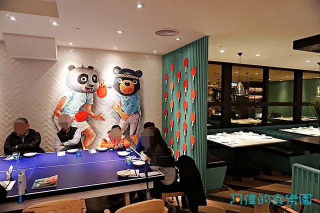 這一區用乒乓球桌當作餐桌,牆上也有好多球拍,原來這是香港本店的風格,每家分店都有喔!而且這張球桌也真的可用來打桌球,很有趣。有沒有發現牆上兩個”球員”,一個是貓熊代表大陸、一個是黑熊代表台灣。