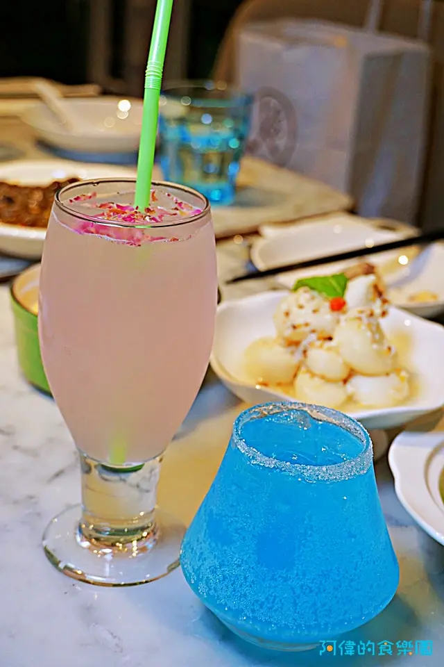 兩杯特色飲料,左邊粉紅色的是玫瑰檸檬飲NT$.85,有玫瑰的清香與檸檬的酸甜,很好喝。