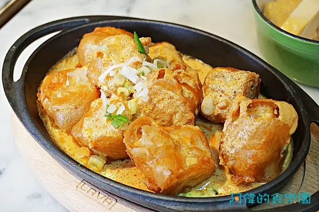 金黃上桌的蘿蔔糕為橫跨廚房點心與炒製兩大部門的獨特料理。點心師傅必須先將台灣金鉤蝦、臘腸爆香後,再與米漿、蘿蔔等蒸熟,強調吃得到蘿蔔絲實在口感的蘿蔔糕,再經由炒鍋師傅接手,將蘿蔔糕裹上特殊脆漿後輕炸,放入以蛋液為底熱鐵板打上,上頭淋上混入椰漿、奶水、辣油等特調而成的金牌叻沙醬才得以完成。包裹在外層的叻沙醬香氣濃厚卻不膩口,蘿蔔糕吃起來外酥內軟,是道完美的蘿蔔糕二次創作料理。