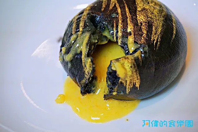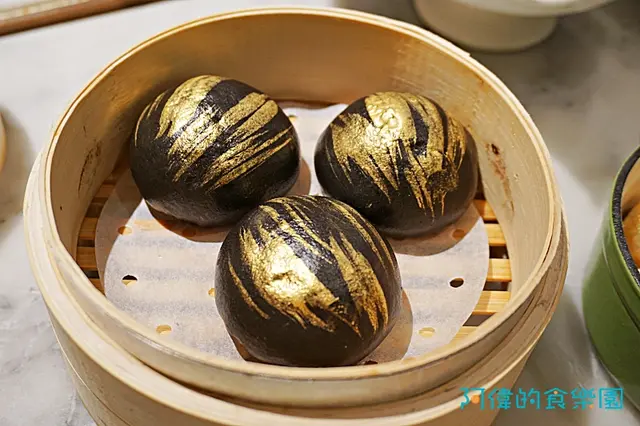 將養生竹炭粉加入少許墨魚漿揉進麵糰增添口感,採以自然發酵1個半小時,再包入烤過的鹹蛋黃、鮮奶油、椰漿等混拌而成的奶黃內餡蒸熟出爐。趁著熱度未退,刷上法國進口的金粉,這道看似豪氣的筆觸實則優雅細緻,與緩慢流出的濃郁內餡形成低調奢華的組合,而發酵得宜的麵糰,讓流沙包吃起來鬆軟不黏牙。