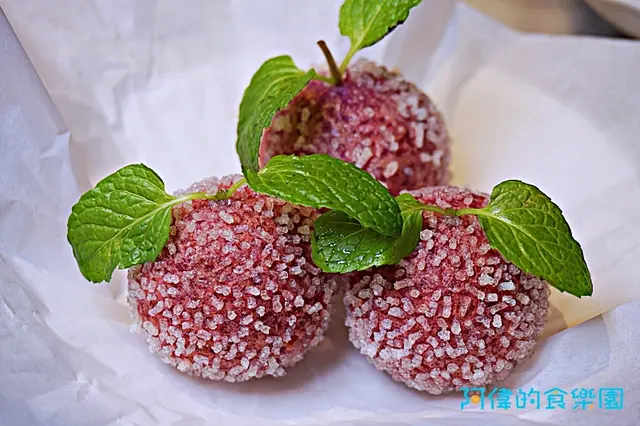 精巧可愛的小小楊梅果,以糯米漿與紫地瓜2:1比例揉和,再與汀麵、豬油、糖做成麵糰,自然莓果色調可看出師傅揉製麵粉的比例恰當。內餡則包入蔓越莓、豆沙等製成圓球狀,最後再輕裹上一層脆白的茶果子油炸完成。小小一粒,工序卻大大繁複的小小楊梅果,紫紅色的外皮黏Q卻不黏牙,內餡則酸甜適中,討喜好吃。