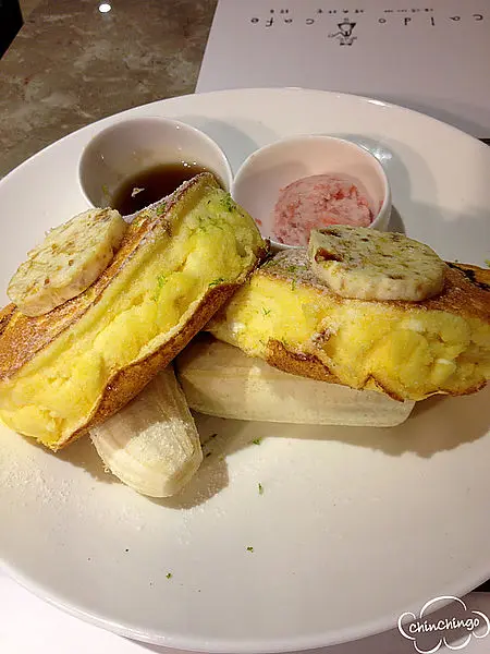 下面放了整條對切的台灣香蕉,大概是讓整個擺牌看起來才不會太空的樣子,然後旁邊的楓糖醬其實有點多餘XD