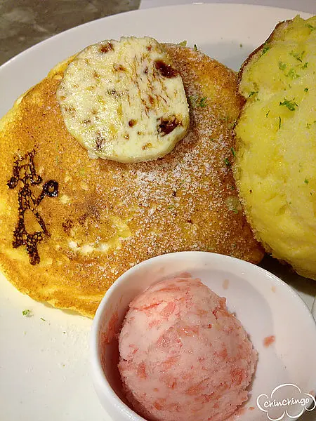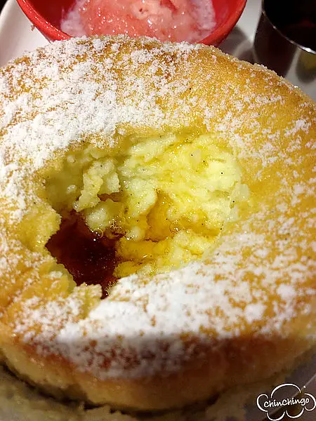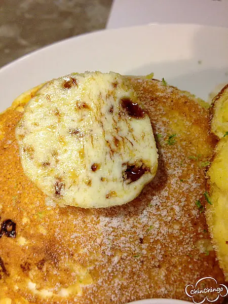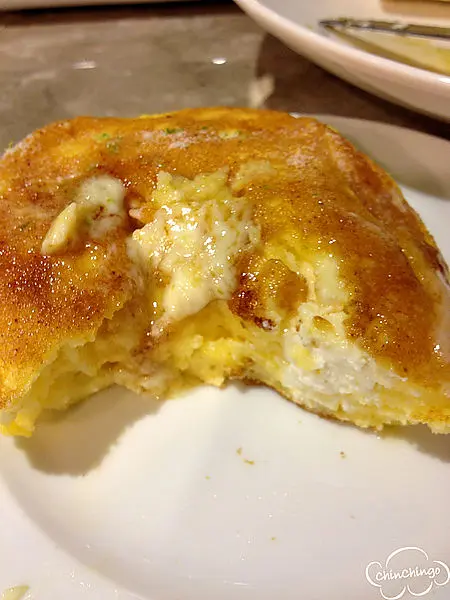 側面的熱蛋糕有一點一點白白的,本來以為是蛋白,切開看發現其實就是Ricotta Cheese,相當好吃!
