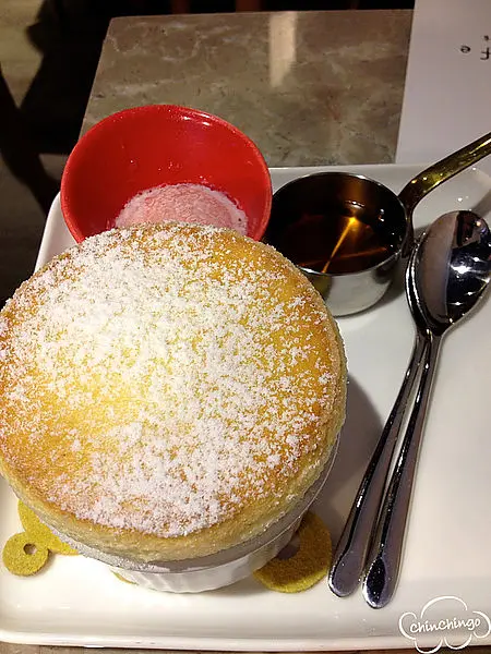 Hot Cake /240元 咖朵的餐點大部分都是現點現作,將蛋白細細打發後再拌入Ricotta Cheese,經過高溫煎烤,鬆鬆軟軟的真的很好吃,口感很像熱的戚風蛋糕,口味有點像舒芙蕾但是比較有咬得到東西的感覺,由於是現做的真的大約等了25分鐘左右XD