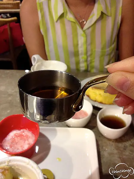 接著再將醬料倒進去舒芙蕾裡,醬料是焦糖海鹽/君度橙酒/桂花釀所熬煮成的,但是我覺得吃起來都是焦糖的味道居多