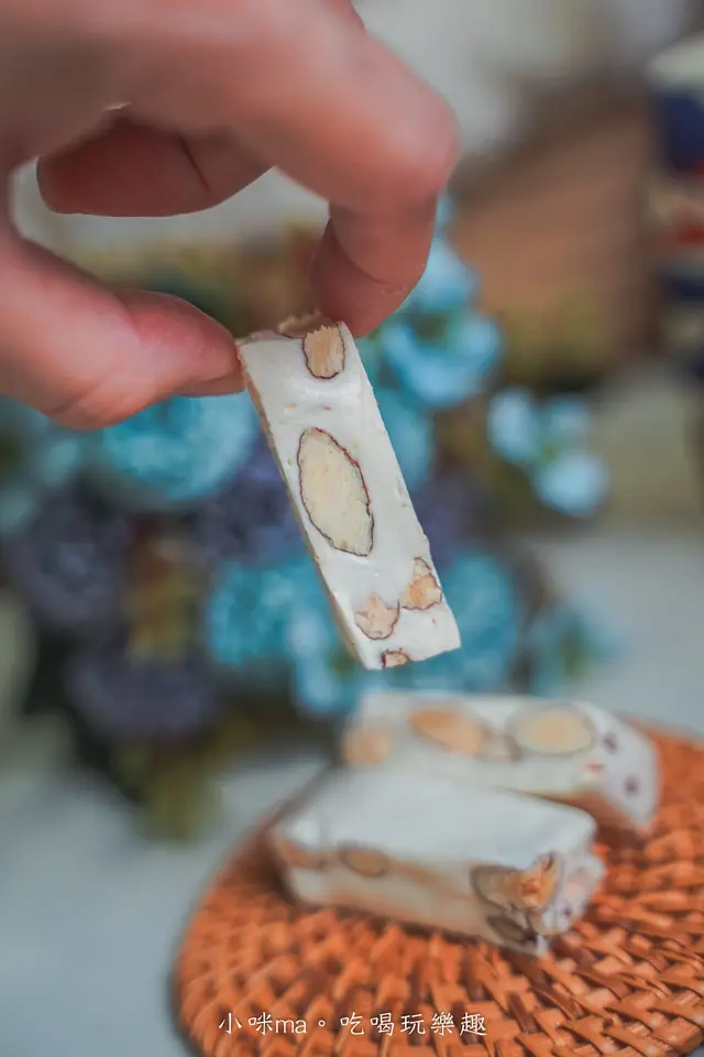 我真的很愛糖村的牛軋糖,他吃起來就是Q彈但不會黏在牙齒上,而且奶香是很順很香的那種,不像有的牛軋糖會有假假的口感,裡頭大顆的杏仁粒增添層次,真的會越嚼越香,難怪會獲獎肯定