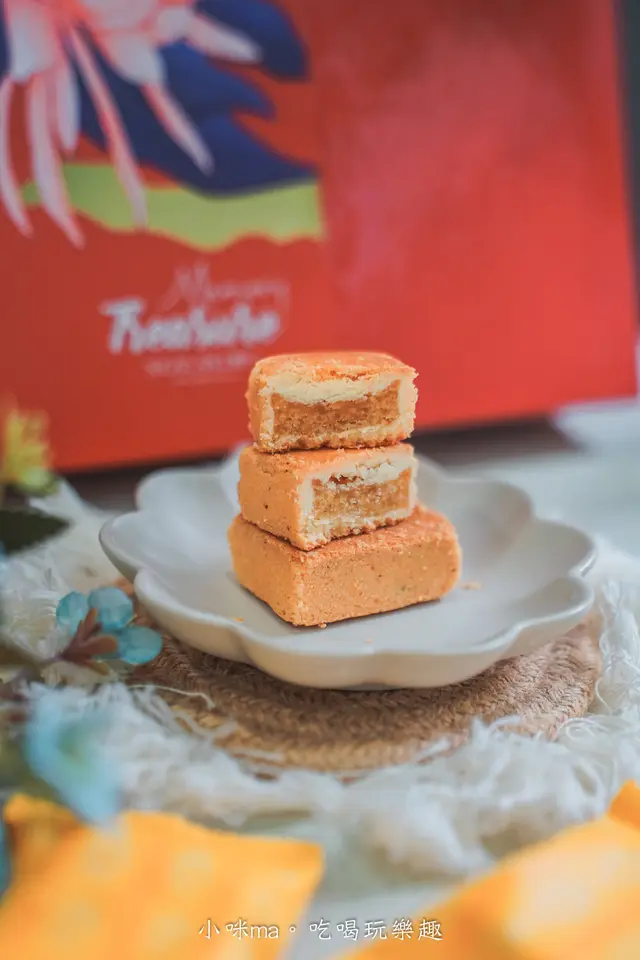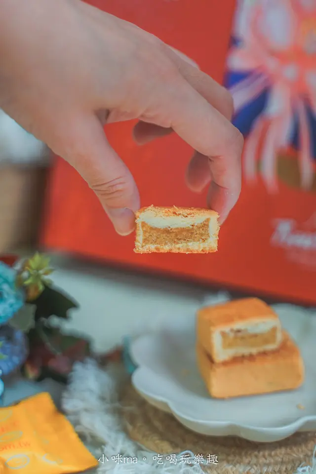 內餡也是別有用心喔,糖村特別用了兩種不同酸甜特性的鳳梨依比例調配,再拌入冬瓜醬提點風味,鳳梨酥還可以吃到鳳梨果粒,吃起來酸甜適中,跟起司外皮超搭的