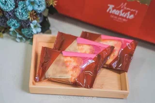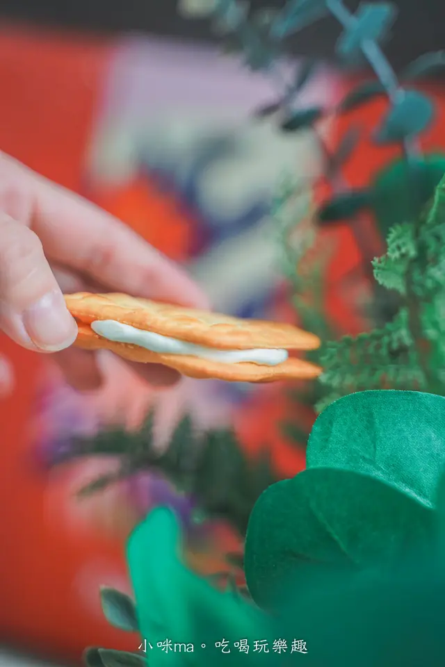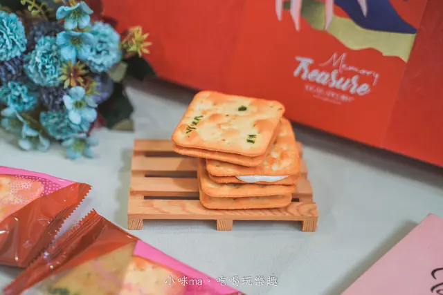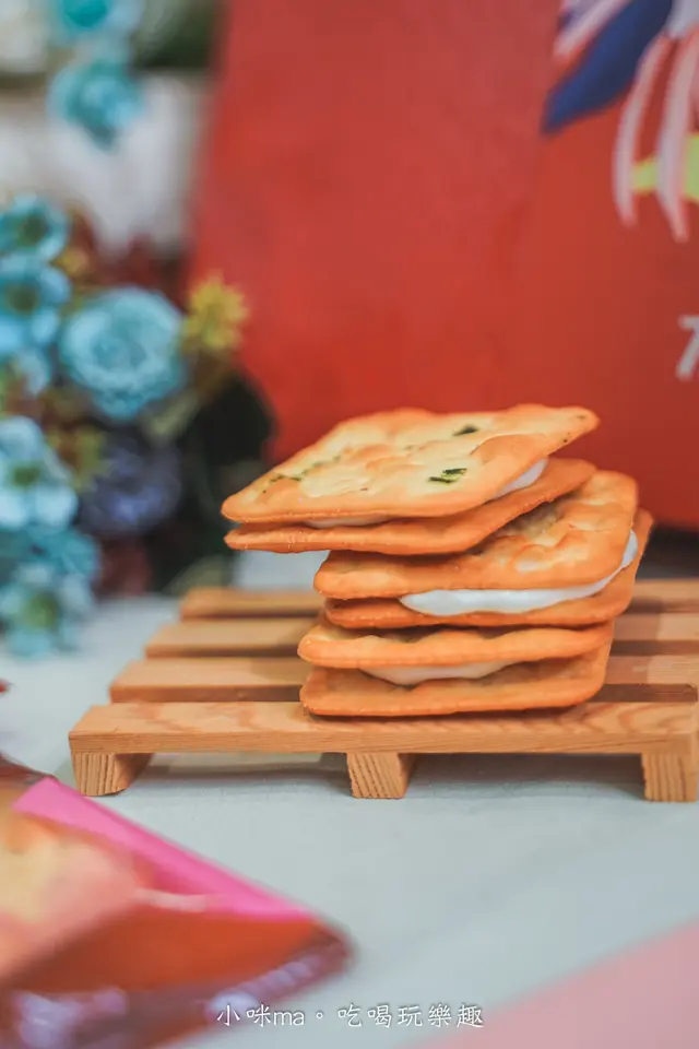 除了牛軋糖讓人愛不釋手之外,還發展出了鹹香滋味的牛軋餅,用了鹹鹹的香蔥蘇打餅乾夾進香醇的牛軋糖,吃起來鹹甜鹹甜也太涮嘴了,這太危險,會讓人一片接一片,哈哈