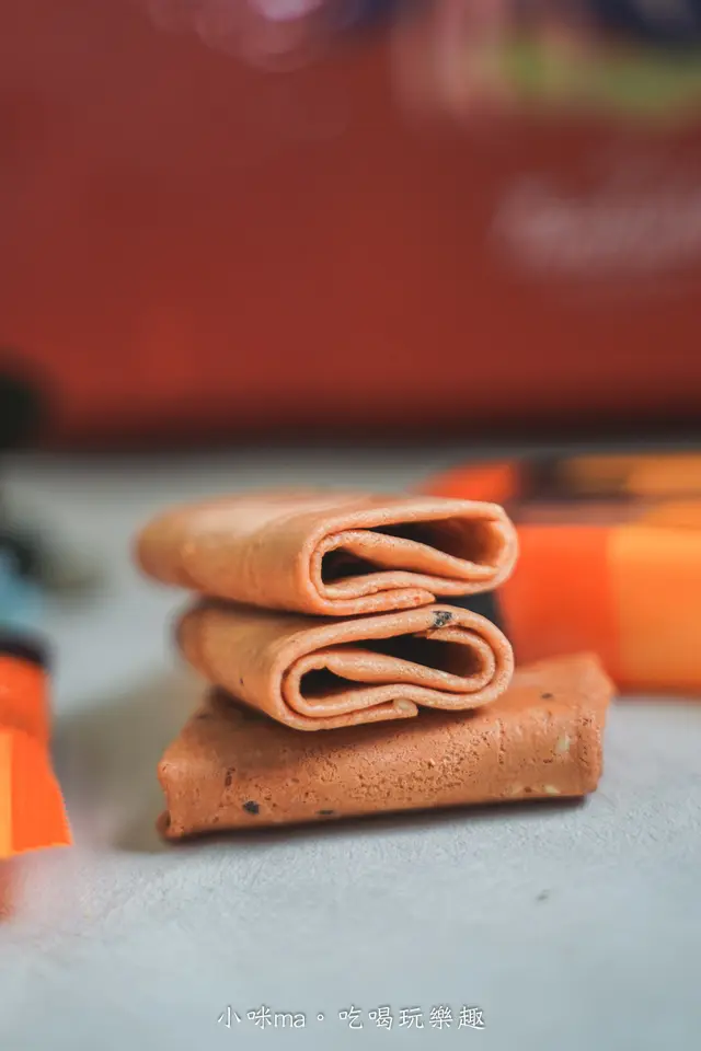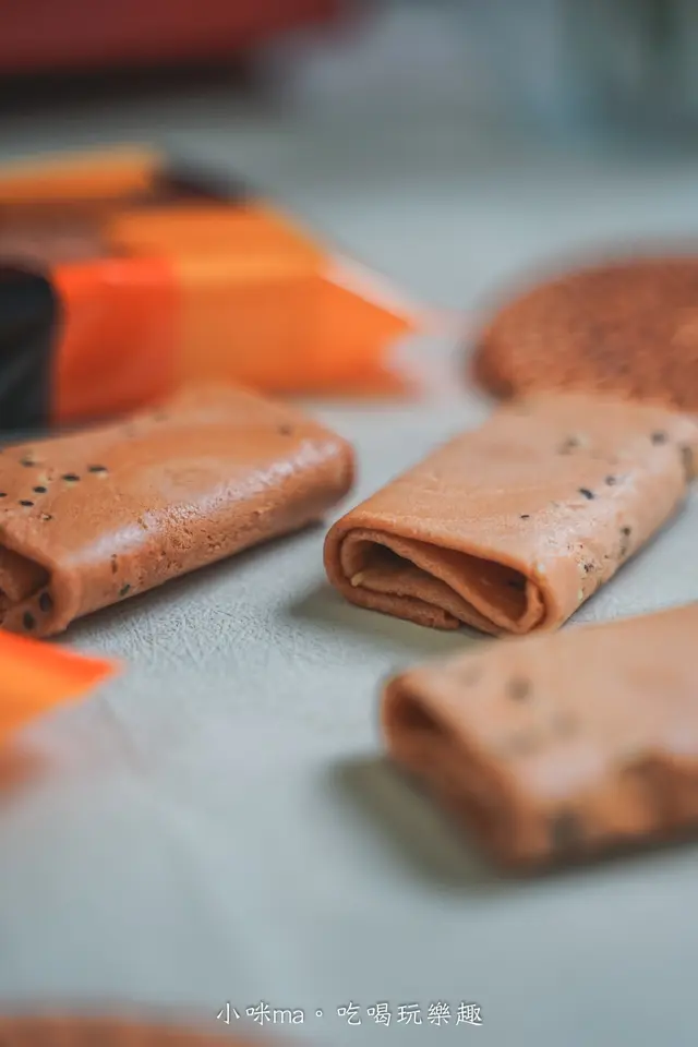 這個捲餅真的是全家大小最愛的小點心,選用法國進口無鹽奶油、雞蛋、日本進口麵粉製成,捲出多重層次,看起來很平凡,但一口咬下你就知道他的厲害,咀嚼後漫出的蛋香、麵粉香,還有黑白芝麻的清香點綴,像是小時候吃的那種復古餅乾,但又更好吃有層次