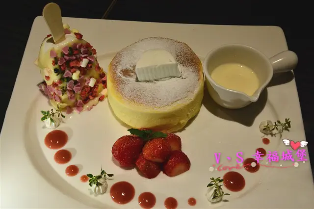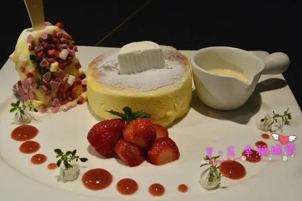 熱乳酪蛋糕淋上香草醬,還有香濃的雪糕及誘人的草莓。