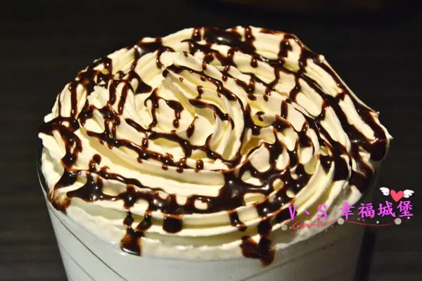 咖啡上放上鮮奶油、再淋上巧克力醬。