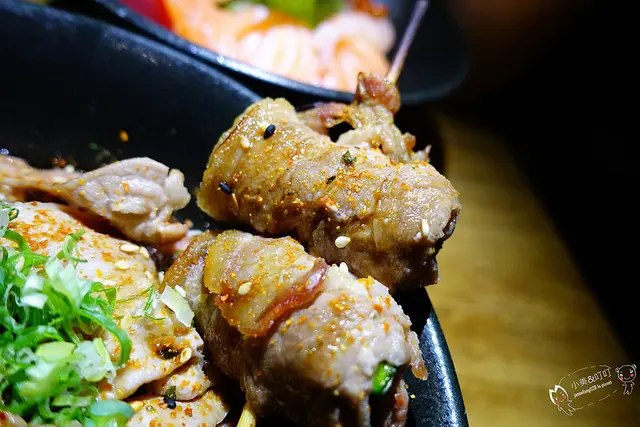 上方灑滿了蔥花與芝麻增添氣味之外還加上了一串蔥花豬肉捲