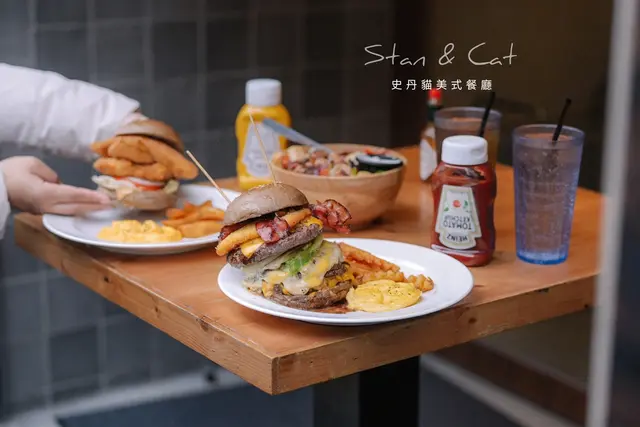 Stan & Cat 史丹貓美式餐廳提供多款創意漢堡有雞、魚,最強的是火烤牛肉堡系列,還有豪華早午餐、美式套餐、三明治、小點心等等,還有多款醬料配料等客製化製作於屬於你個人喜好的漢堡,主力商品「漢堡與啤酒」,餐點前三名推薦「花生醬培根牛肉堡、歐姆蛋火烤雞腿堡、火烤牛排早午餐」。選擇很多樣來好幾次都吃不膩!