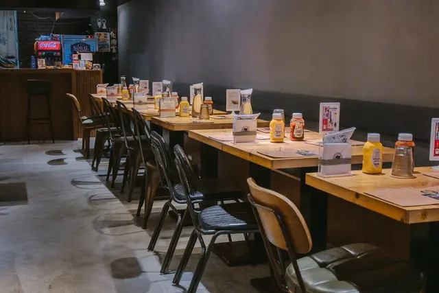 約有8桌4人座位區,桌上都有擺放醬料罐、水瓶與紙巾、漢堡袋。