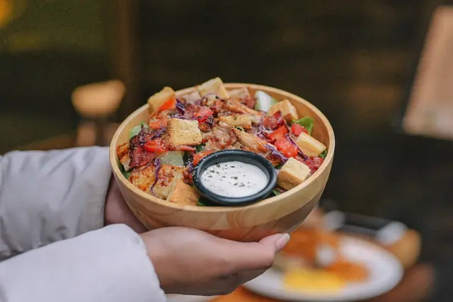 擔心大魚大肉吃太多點沙拉均衡一下,送上來滿大一碗有滿滿的生菜、培根、蕃茄、麵包塊,火烤雞腿肉等,都可以當一份主餐了,不喜歡吃漢堡的朋友也能相當飽足,份量真的很實在。