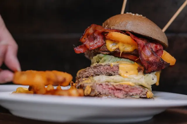 3片5.5盎司火烤牛肉排、3片美式起司、2片培根、蜂蜜芥末醬組合而成,我還加點一片炸起司片看起來更澎湃,這組合很邪惡一定yummy的好吃。