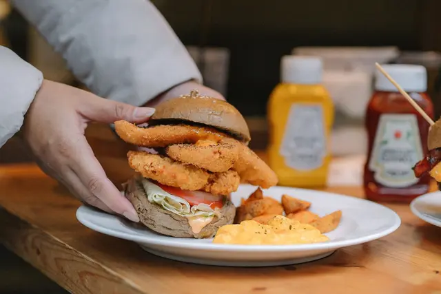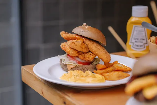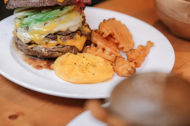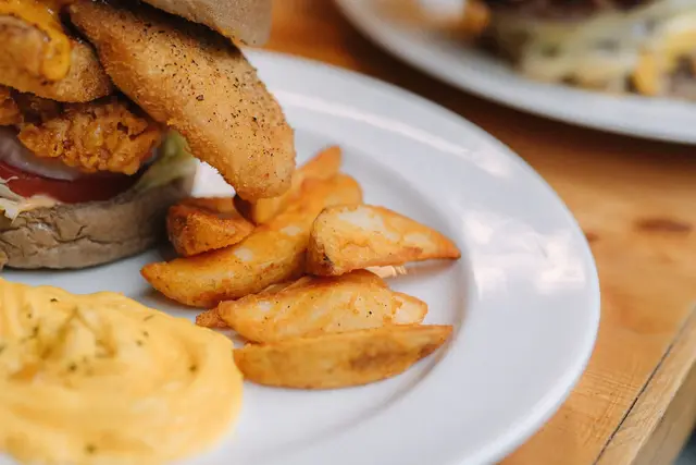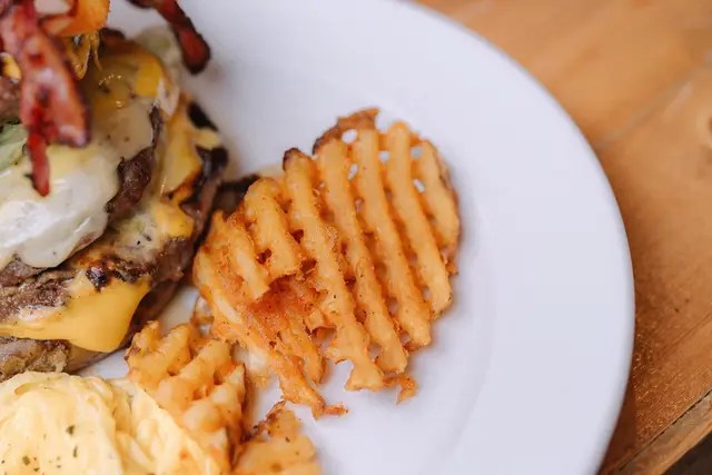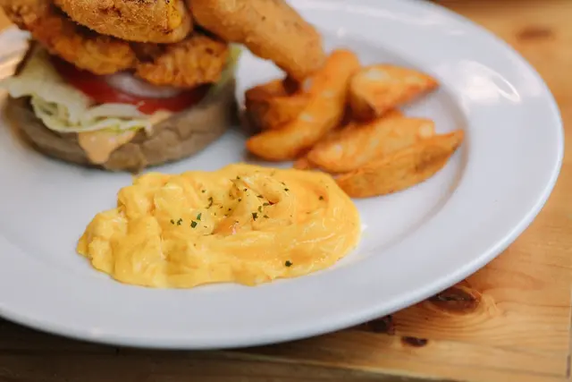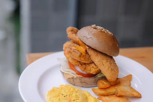 套餐可自由選擇2份配菜(現炸薯條、調味薯格、黃金薯條、培根馬鈴薯泥、有機炒蛋),
