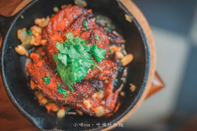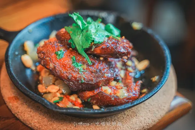 用了黑糖下去醃漬的雞翅吃起來甜甜的,上頭還用了花生、蜂蜜、香菜、辣椒提味,每一口的層次都好豐富,甜甜辣辣的好涮嘴,光前面兩道小酒館料理就完全get住我們的味蕾,這兩道真的大推
