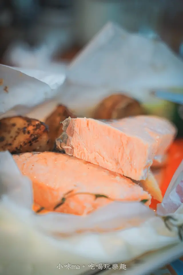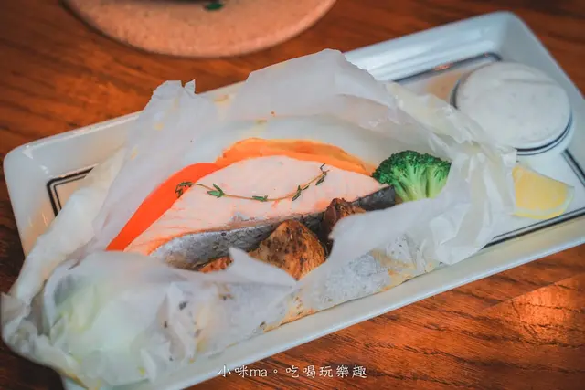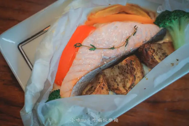想要吃得煎健康也可以選擇紙包鮭魚,一大塊鮭魚用紙包的料理方式把鮮甜鎖住,鮭魚吃起來還是很juicy,一旁搭配著烤鮮蔬,這一道清爽不鹹膩,好適合女孩子啊