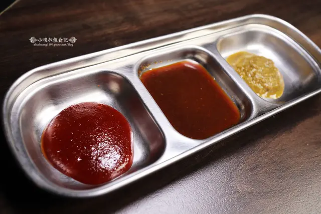 店家送上自製調配的沾醬,由左至右,韓式辣醬、梨汁醬、青蒜醬