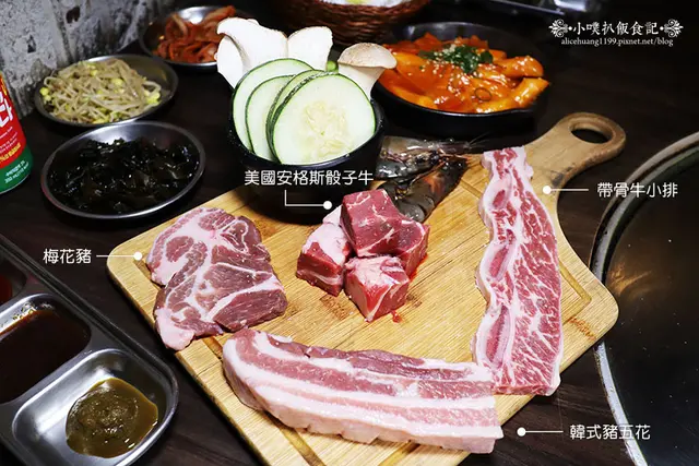 特選梨汁醬醃帶骨牛小排、精選台灣優質梅花豬、經典韓式豬五花、嚴選美國安格斯骰子牛