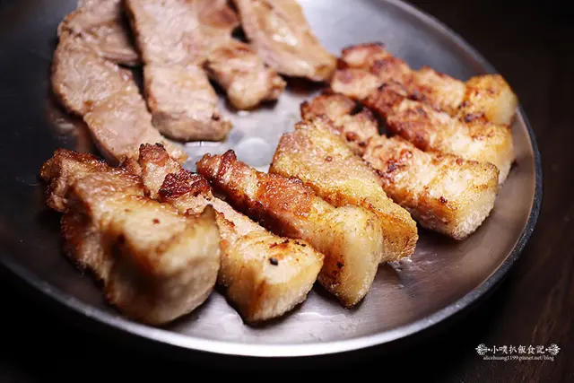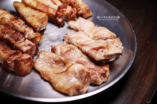 這是韓式燒烤必吃的經典肉品,外層烤至金黃焦香,藉由燒烤過程,逼出肉質的自然油脂,肥瘦比例剛剛好的口感,實為美妙,沾附青蒜醬,美味無比