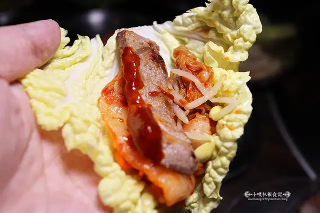 以大白菜包覆梅花豬,夾入韓式小菜及沾附韓式辣醬,搭配生菜的口感,多汁又香甜的滋味,搭配肉質的多層次美味,讓人一口接一口啊!!!