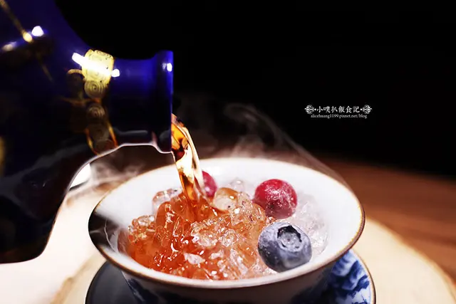 另附一個相當雅緻的中國風味茶杯,置放冰塊及蔓越莓及藍莓,將瓶中的酒品,緩緩的倒入茶杯中,這畫面真得相當奪人目光啊!!!