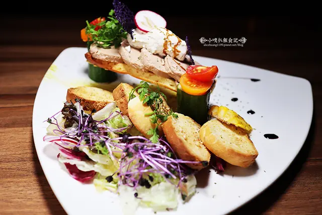 相當精緻的法式經典菜餚,以美味無比的鵝肝醬為主體,上面擺放酸乳酪醬及搭配清新蔬菜,旁邊再置放烤製酥香的法國麵包