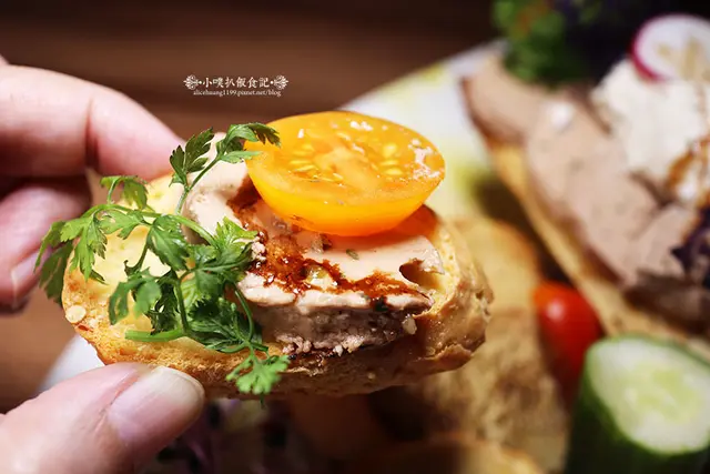 以一片烤製酥脆的法國麵包,上面抹上一小片鵝肝,搭配一些時蔬及抹上酸乳酪醬,口感簡直一級棒,而且極富層次感,相當完美的前菜餐點