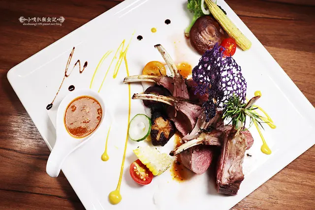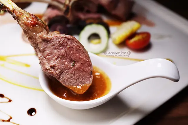 以頂級法式小羔羊排六隻擺盤,主廚細心烤至大約五分熟,外皮烤製焦香,內層肉質相當粉嫩細緻,軟嫩又多汁