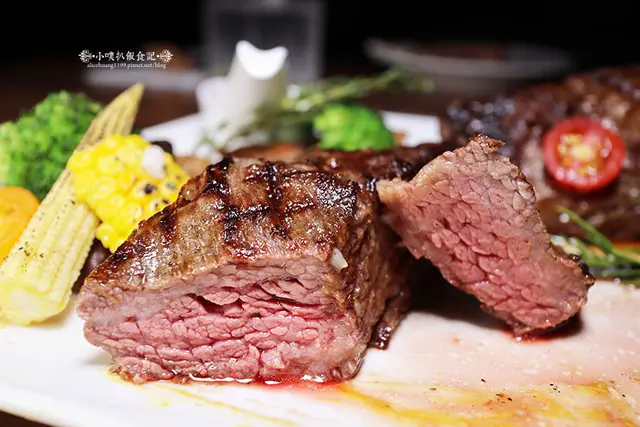 仔細的切分牛排,外皮烤製相當焦香美味,內層的肉質大約呈現5分熟左右,口感相當軟嫩鮮美,並有新鮮的肉質香氣及鮮度