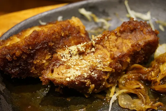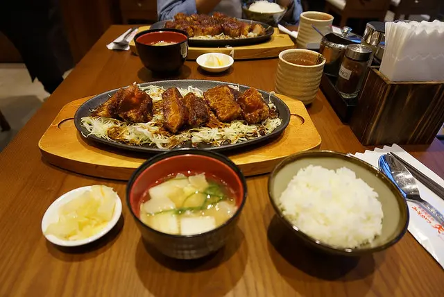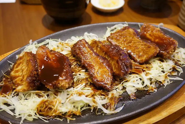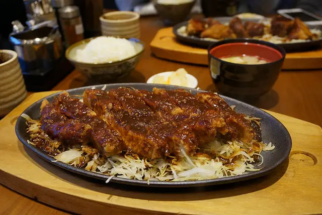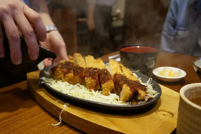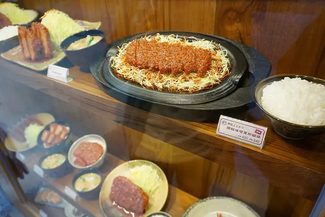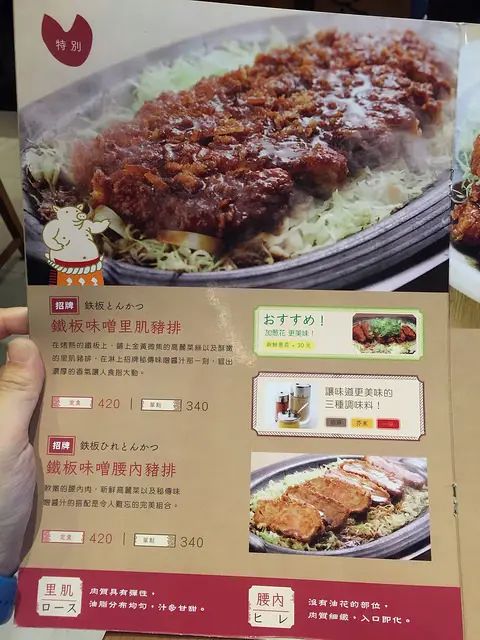炸豬排上頭淋上特製味噌醬 以鐵板加熱、滋滋作響