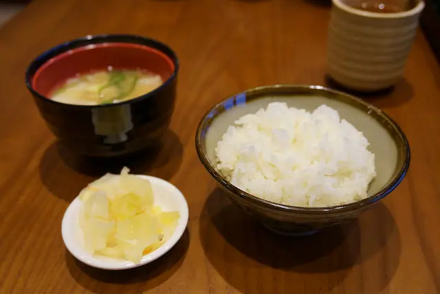 定食包含主食炸豬排、月光米飯、豬肉味噌湯和漬物