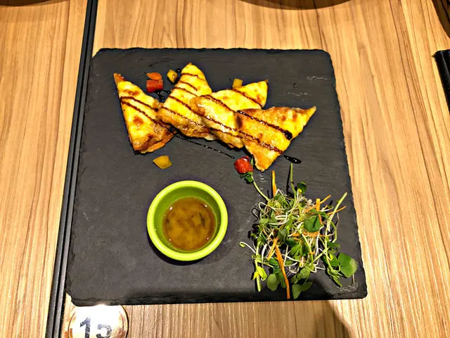 厚度適中,吃起來絲毫不油膩,有一種吃薄片比薩的感覺,因為上頭有著起司作為料理部分