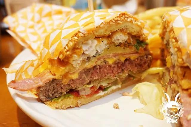 屬於海陸的組合 有一塊魚排、漢堡排以及起司片、培根等