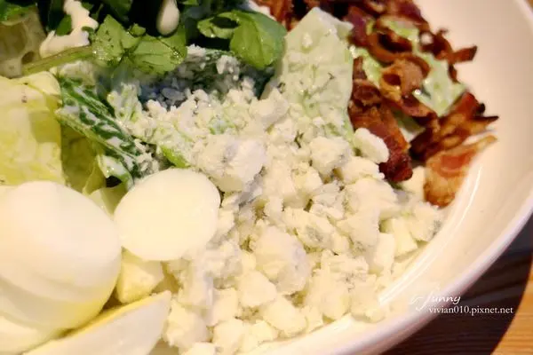 這天吃到的柯布沙拉中,有萵苣、蘋果、蕃茄、培根、雞肉、水煮蛋及藍紋起司。