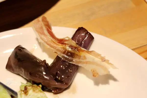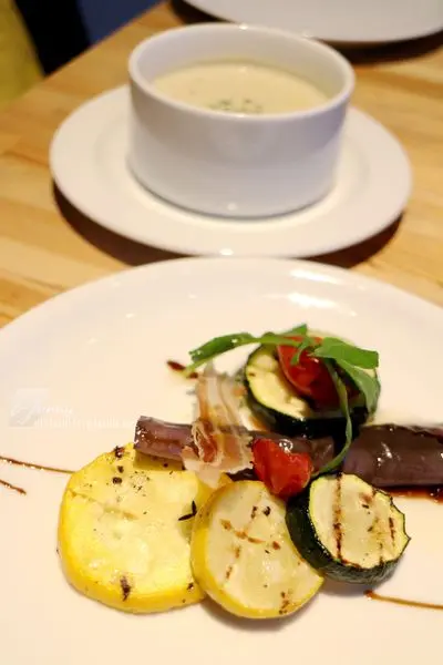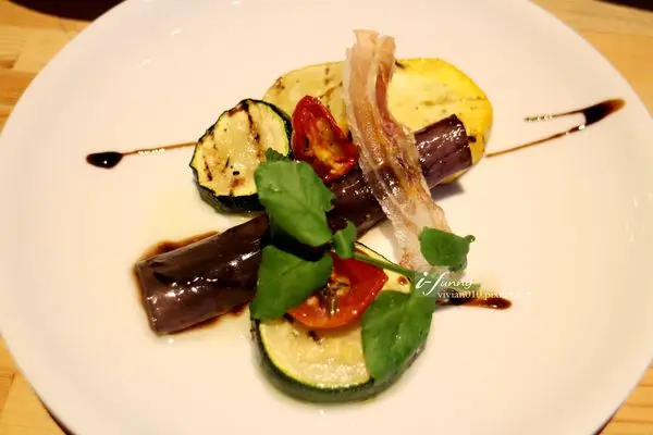 櫛瓜及茄子利用簡單的烤法,保留著食材本身的原味,加以少許紅酒醋調味。