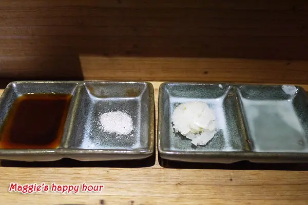 桌上也放好各種口味的沾醬,從右邊開始分別是檸檬汁、塩蔥、椒塩和烤肉醬,用來搭配肉類食用。