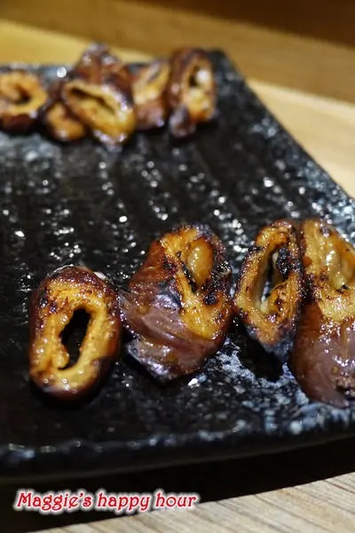 「明太子烤飯糰」經過炭火微微上色後看起來讓人食指大動,弄開中心一看裡面的明太子好多,飯糰外層的米香味和明太子淡淡的鹹味中和在一起,真的很好吃!