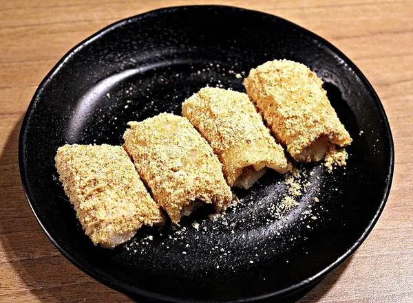 日式年糕 QQ年糕烤到微膨 沾上香甜煉乳和花生粉一起入口 甜到心坎裡
