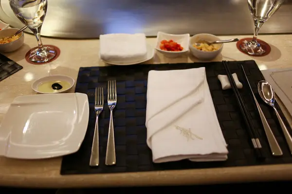 桌上一開始是長這樣的,齊全的餐具,連筷子都有,刀子的設計很特別,拿取很方便,坐定位後服務生立刻會詢問要礦泉水或氣泡水。