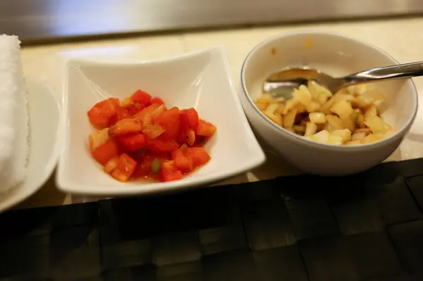 前方有兩種調味料是類似莎莎醬的番茄丁和調味過的洋蔥末。