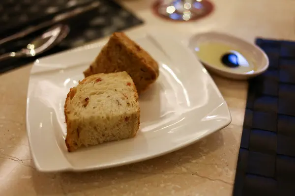 一份有兩種現烤的麵包,黑的是全麥麵包,白的是培根麵包,皆可沾油醋醬食用,但我更愛搭配酸酸的番茄丁。